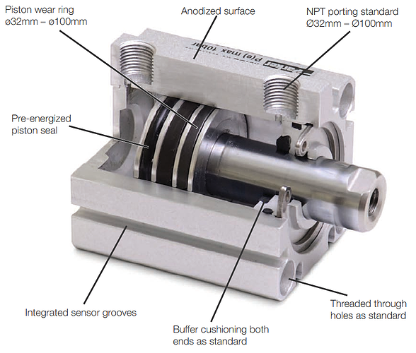 - Teflon piston wear ring (available with magnetic option, 32 – 100 mm bores) provides increased service life.
